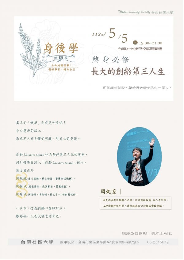 地點:台南社大後甲校區 群育樓(台南市東區東平路260號/後甲國中後校門進入 左側)